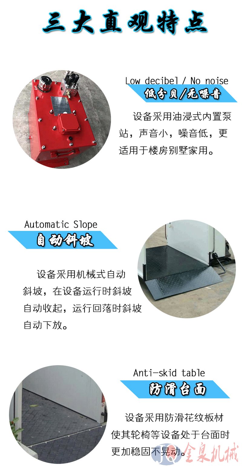 濟南金泉升降機械有限公司是國內生產無障礙升降設備的廠家之一。公司主要經營無障礙升降平臺,無障礙升降機,無障礙電梯,斜掛式升降平臺,斜掛式升降機,殘疾人升降平臺,殘疾人升降機,殘疾人電梯,輪椅升降平臺,輪椅升降機,座椅電梯,樓梯升降椅,爬樓機,爬樓車,車載平臺,小型電梯,家用電梯等。本公司生產設備精良,工藝先進合理,檢測手段齊全,技術力量雄厚;產品品種齊全,長期銷往海外及全國各地,受到廣大用戶的一致好評。